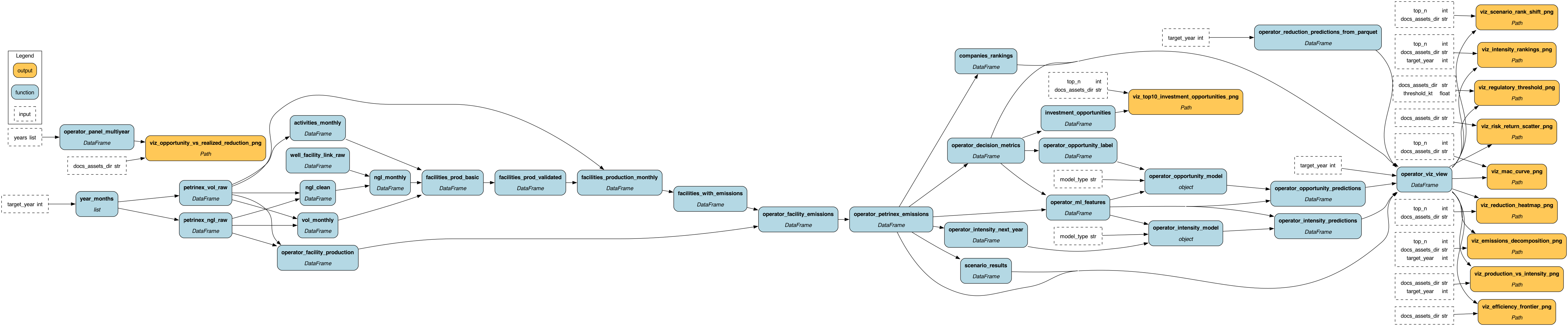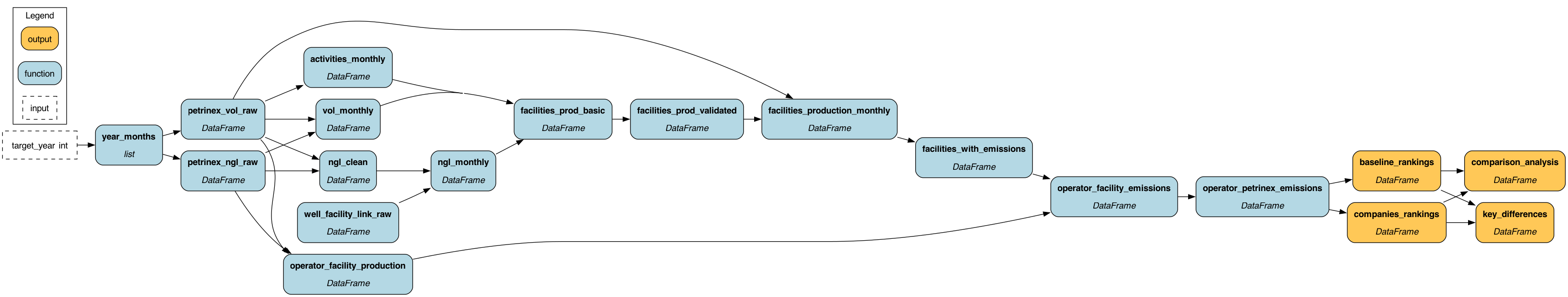 This section shows the core DAG layers that drive the analysis pipeline: 1. Viz layer (top): Decision outputs including rankings, scenarios, and visualizations 2. Gold emissions (bottom left): Facility emissions → operator-level emissions 3. Gold rankings (bottom right): Baseline rankings, composite scoring, and comparison logic
