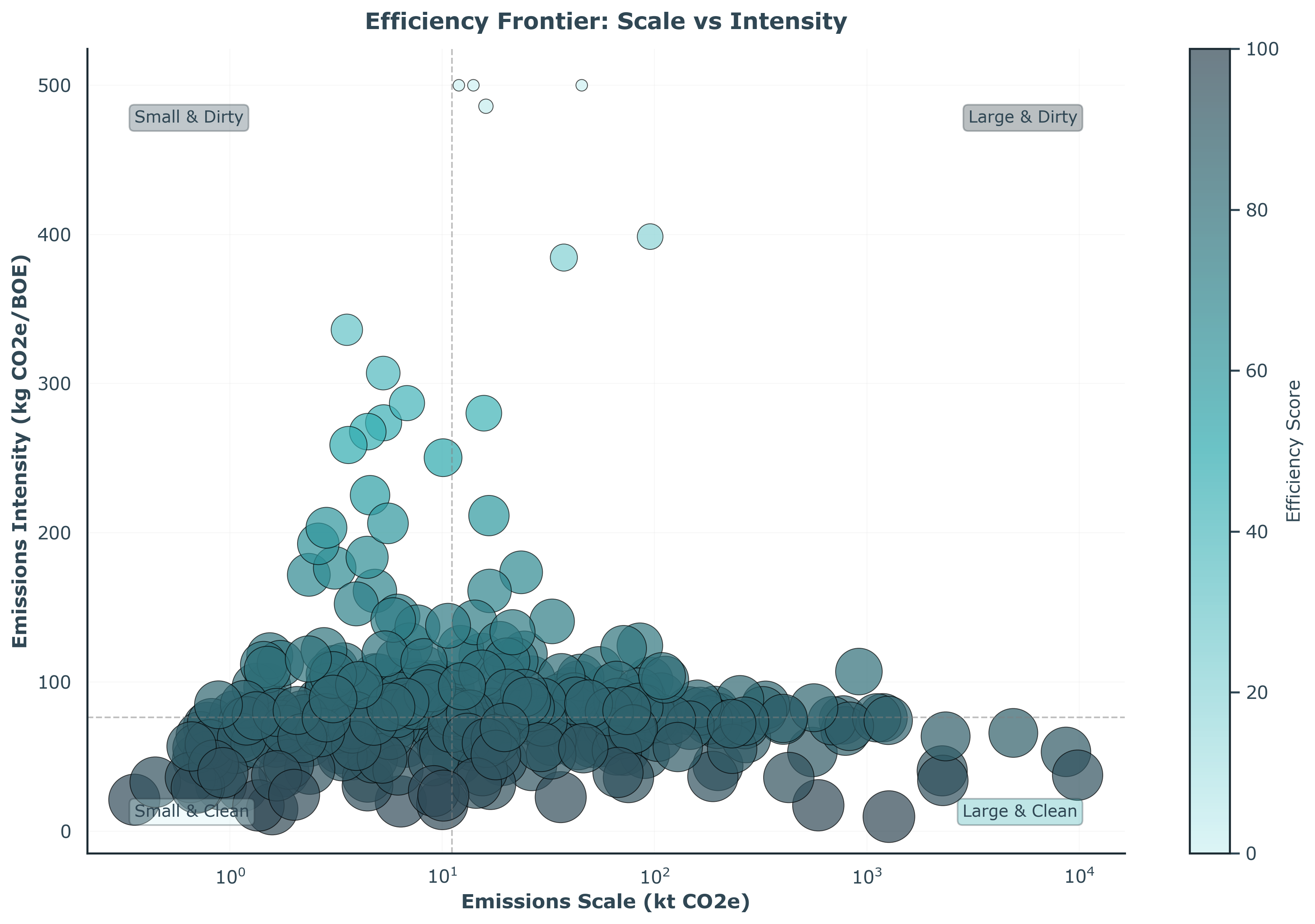 Figure 7: Production vs emissions intensity efficiency frontier. Operators in the lower right (high production, low intensity) are most efficient.