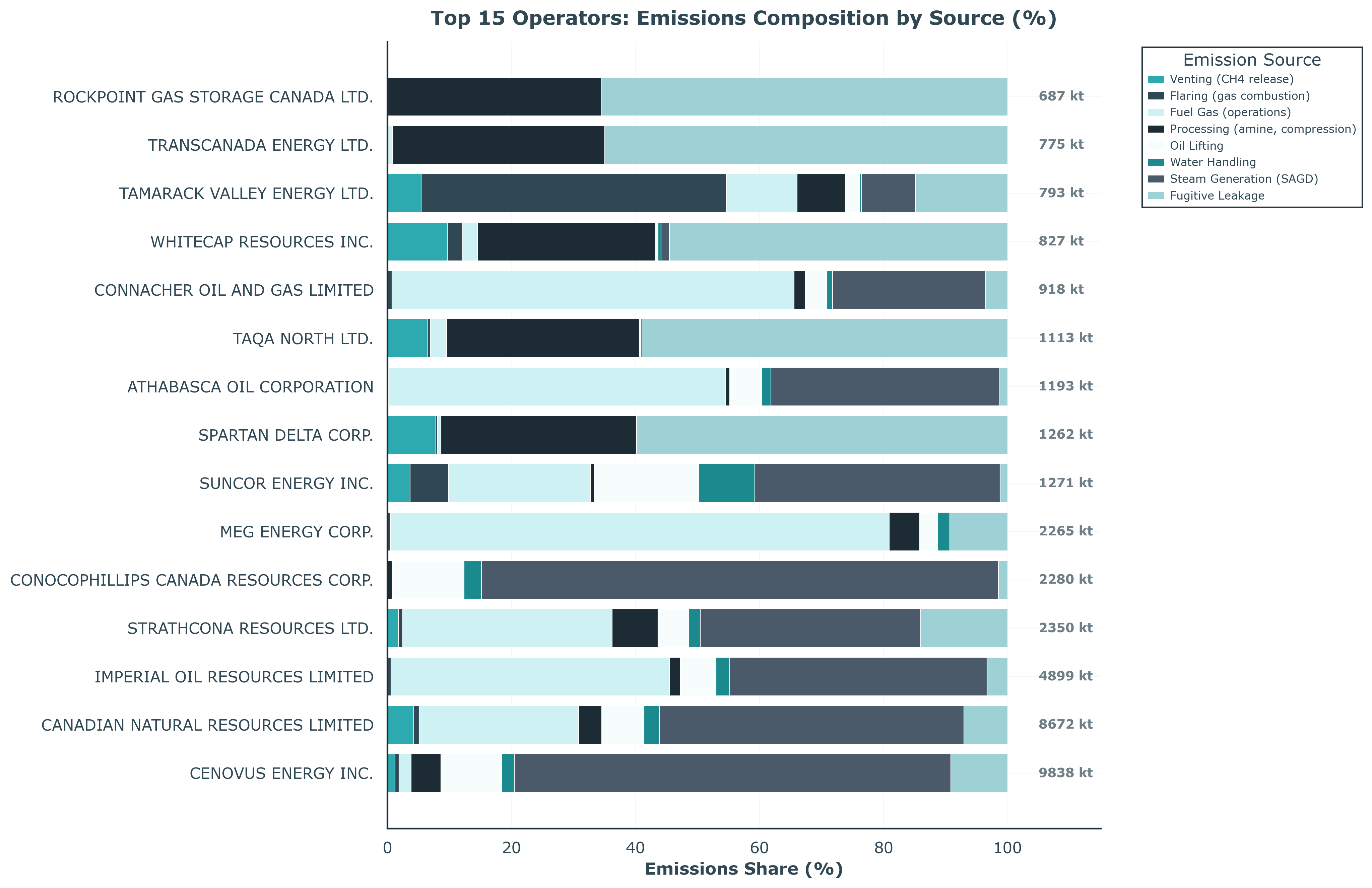 Figure 9: Stacked decomposition of emissions by source for top operators. Shows the relative contribution of venting, flaring, fuel, processing, and other sources.
