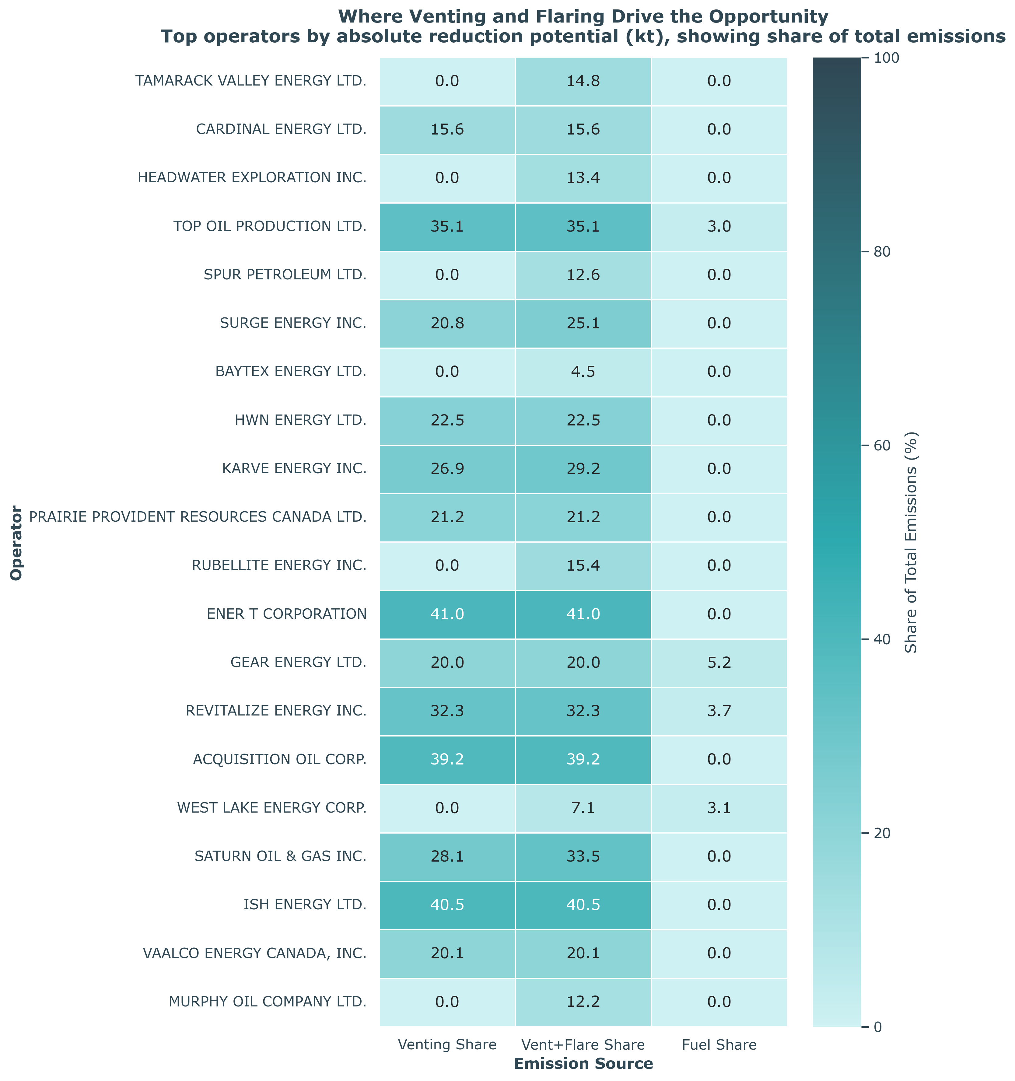 Figure 6: Top 20 operators ranked by venting and flaring reduction opportunities. Color intensity represents total reduction potential.